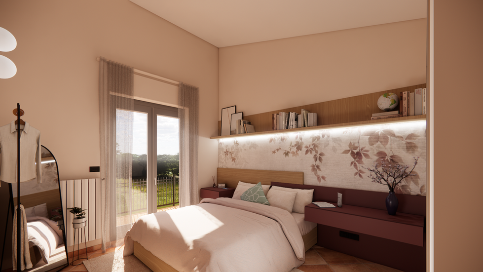 • Piano 1 – Camera da letto – Texture morbide e palette calde, per un rifugio intimo e romantico.